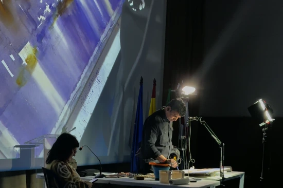 The artists worked live on stage with a full watercolor setup, while their creative process was recorded and projected in real time onto a large screen behind them, allowing the entire audience to clearly follow each step of the creative process, even in a large-capacity venue.